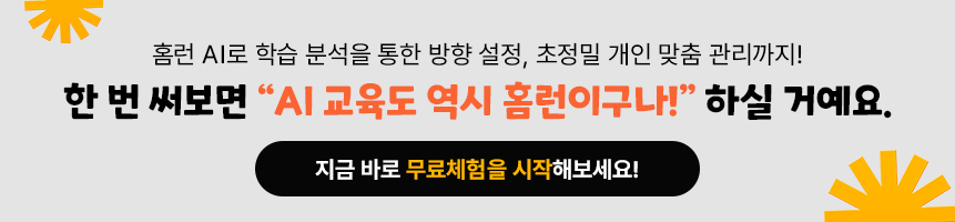 학부모님, AI 시대를 지금부터 준비하고 싶으신가요? 홈런 무료체험을 신청하시면 태블릿 학습과 개인화된 피드백을 제공하는 홈런을 통해 AI 시대를 미리 경험하실 수 있습니다.