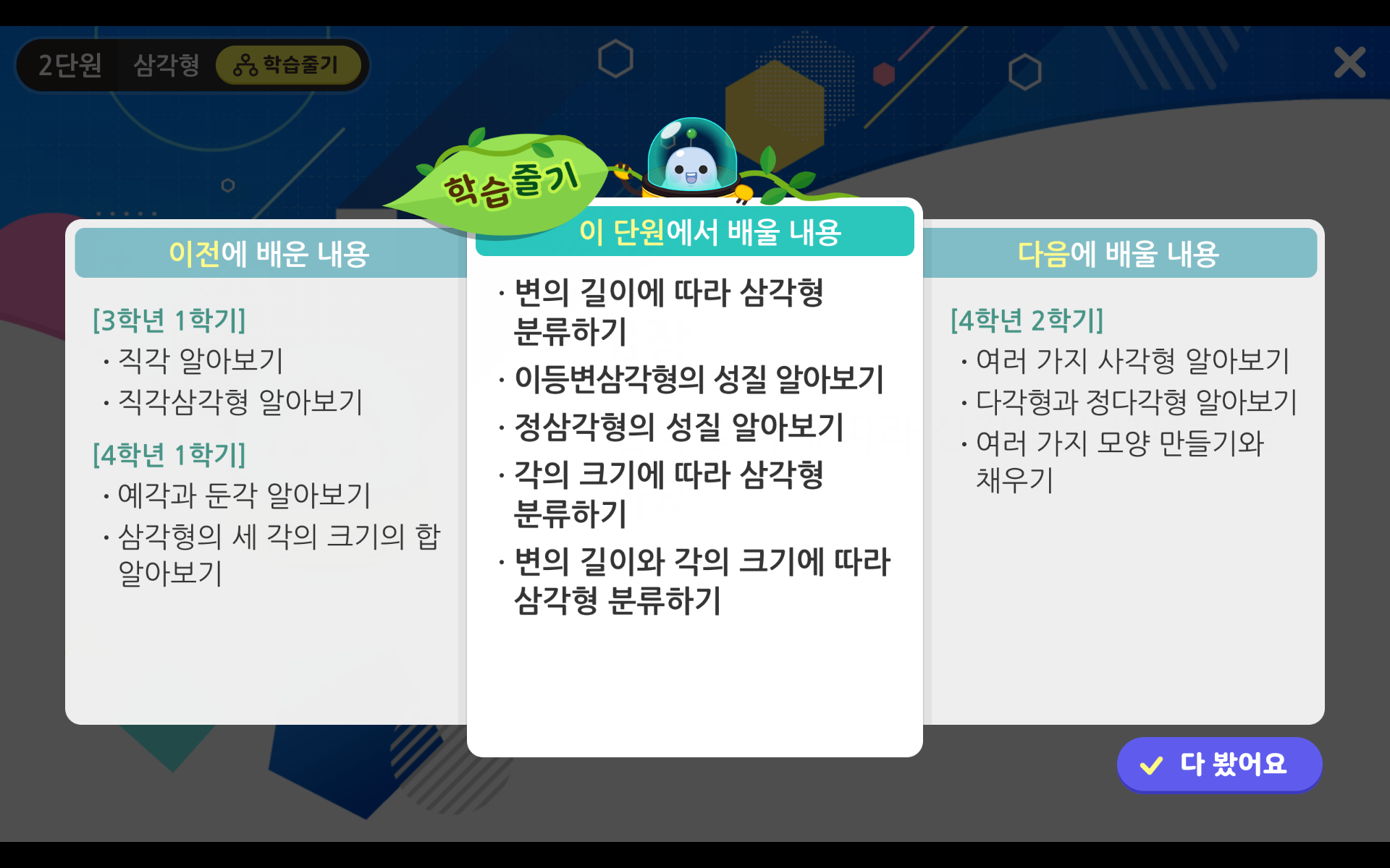 2단원 삼각형에서는 변과 각에 따른 특징을 지닌 삼각형의 이름, 특징, 모양을 배웁니다.