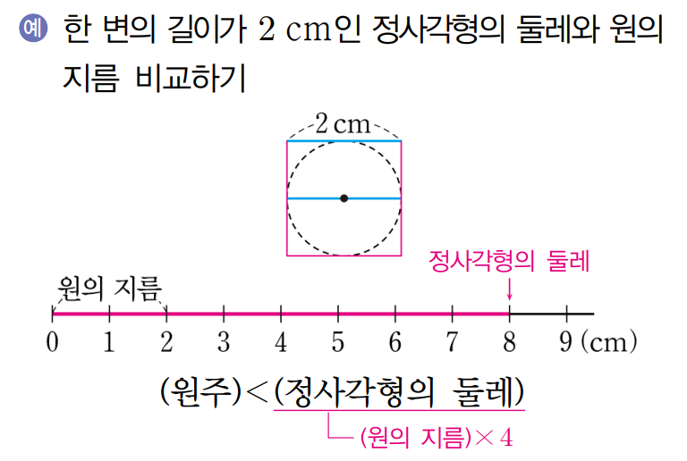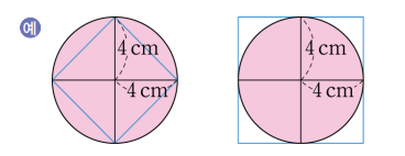원 안에 있는 정사각형과 원의 넓이를 먼저 비교하고, 원과 원 밖에 있는 정사각형의 넓이를 비교하면 됩니다. 예시를 풀이해 이해해봅시다. ∙ (원 안에 있는 정사각형의 넓이) = (마름모의 넓이)=(한 대각선의 길이)×(다른 대각선의 길이) ÷2 = 8 x 8 ÷2 = 32 (㎠) ※정사각형은 마름모입니다. ∙ (원 밖에 있는 정사각형의 넓이) = (한 변의 길이)×(한 변의 길이) = 8 x 8 = 64 (㎠) 즉, 32㎠ < (반지름이 4cm인 원의 넓이) < 64㎠ 이므로 원의 넓이는 48㎠쯤 될 것 입니다.