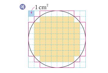 ㄴ) 모눈종이를 이용하여 원의 넓이 어림하기 두 번쨰로 모눈종이를 이용하여 원의 넓이 어림하기입니다. 예시를 풀이해 이해해봅시다. 노란색 모눈은 60칸이므로 노란색 모눈의 넓이는 60㎠입니다. 빨간색 선 안쪽 모눈은