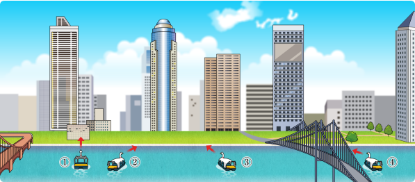 ㉠: 건물의 오른쪽 면이 보이려면 ③번 오리 배에서 찍어야 합니다. ㉡: 가장 왼쪽 건물이 보이지 않으려면 ②번 오리 배에서 찍어야 합니다. ㉢: 건물의 정면이 보이려면 ①번 오리 배에서 찍어야 합니다. ㉣: 다리가 사진의 왼쪽에 있으면서 건물의 오른쪽 면이 보이려면 ④번 오리배에서 찍어야 합니다.