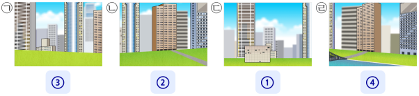 2)지혜는 공원에 있는 건물의 사진을 여러 방향에서 찍었습니다. 각 사진은 어느 방향에서 찍은 것인지 이야기해 보세요.