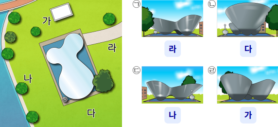 ㉠: 나무가 왼쪽에, 직육면체 모양 건물이 오른쪽에 보이는 곳을 찾으면 라입니다. ㉡: 조각상과 나무의 위치를 생각해 보면 다입니다. ㉢: 나무가 가운데 건물의 뒤쪽에 보이므로 나에서 찍은 사진입니다. ㉣: 직육면체 모양 건물은 안 보이고 나무가 왼쪽에 보이므로 가에서 찍은 사진입니다.