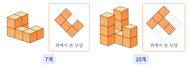 7)친구들이 각자 쌓은 모양을 위에서 본 모양에 수를 쓰는 방법으로 나타냈습니다.