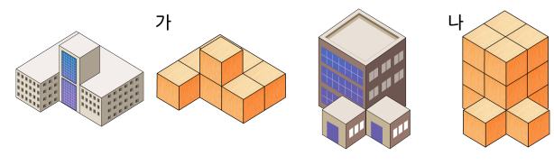 3)건물 모양을 쌓기나무로 만들었습니다. 각 사진은 어느 방향에서 찍은 것인지 이야기해 보세요. (1) 가와 나 모양을 만드는 데 필요한 쌓기 나무는 각각 몇 개인가요? - 가: 8개, 나: 예) 15개