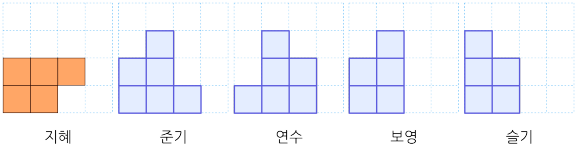 지혜네 모둠친구들은 쌓기나무로 쌓은 모양을 여러 방향에서 보고, 체험 활동 보고서를 작성했습니다.