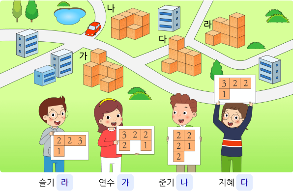 그림을 보고 누가 어떤 모양을 쌓았는지 찾아봅시다.