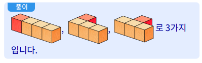(1) 쌓기나무 4개로 만들 수 있는 서로 다른 모양을 찾는 방법을 생각해 보세요. - 예) 쌓기나무 3개로 만들 수 있는 모양에 쌓기나무를 1개 더 붙여서 찾습니다.