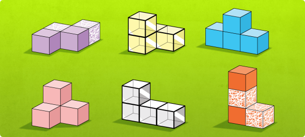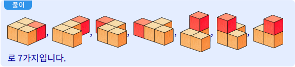 전시된 작품과 같이 쌓기나무 4개로 만들 수 있는 서로 다른 모양은 모두 몇 가지인지 알아봅시다.