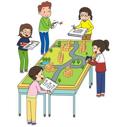 (1) 모둠에서 어떤 도시를 만들지 이야기해 보세요. (2) 각자 어떤 건물을 만들지 생각해 보세요. (3) 생각한 건물을 쌓기나무로 만들어 보세요. (4) 만든 건물을 모아 도시를 만들어 보세요. (5) 도시의 건물을 여러 가지 방법으로 표현해 보세요.