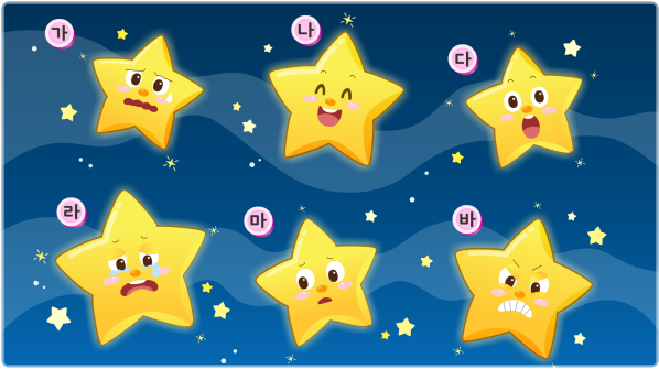 1)별의 표정에 어울리는 마음을 생각해 봅시다. 예) (가): 무서워요 / (나): 즐거워요 / (다): 놀라워요 / (라): 슬퍼요 / (마): 부끄러워요 / (바): 화나요 등