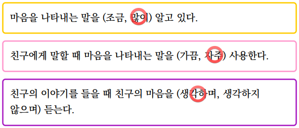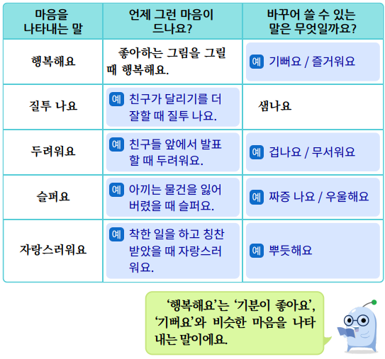 2) 친구들과 여러 가지 말을 더 생각해 봅시다. 예) 행복해요 / 화나요 / 외로워요 / 심심해요 등