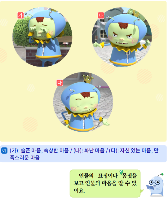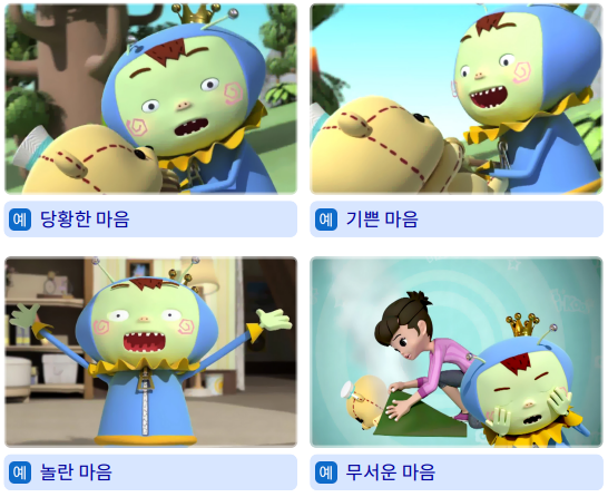 6) 인물의 마음을 이해하며 만화 영화를 보아요. 1) 인물의 표정에 알맞은 마음을 친구들과 이야기해 봅시다.