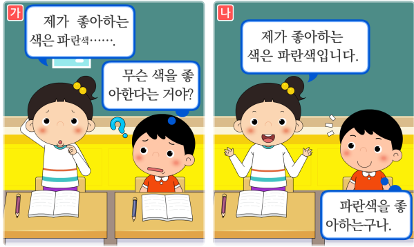 - 그림 “가”에서 남자아이가 여자아이의 말을 제대로 알아듣지 못한 까 닭은 무엇인가요? 예) 여자아이의 목소리가 작아서 잘 안 들렸기 때문인 것 같습니다. / 여자아이가 말끝을 흐려서 무엇이라고 하는지 못 알아들었기 때문입니다.