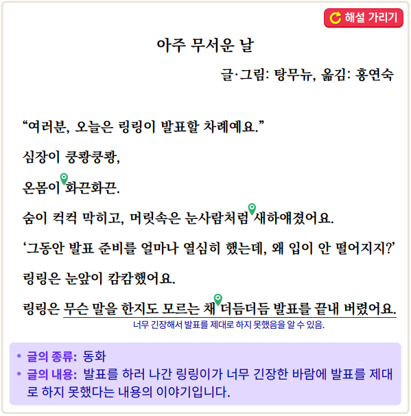 2. 다른 사람 앞에서 말한 경험을 떠올리며 「아주 무서운 날」을 읽어 봅시다. (1) 링링과 달리 다른 사람 앞에서 자신 있게 발표한 경험을 친구들과 이야기해 봅시다. 예) 처음 만난 짝에게 제 소개를 할 때 자신 있게 말했습니다. / 수업 시간에 제가 아는 답을 자신 있게 발표한 적이 있습니다.