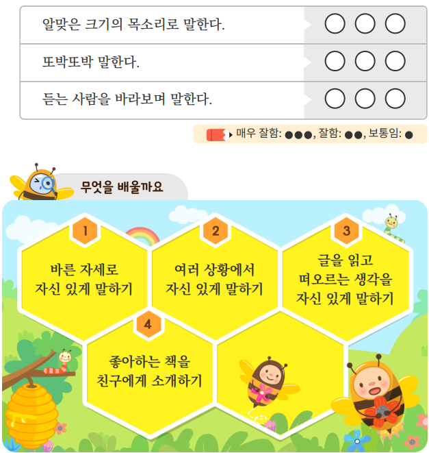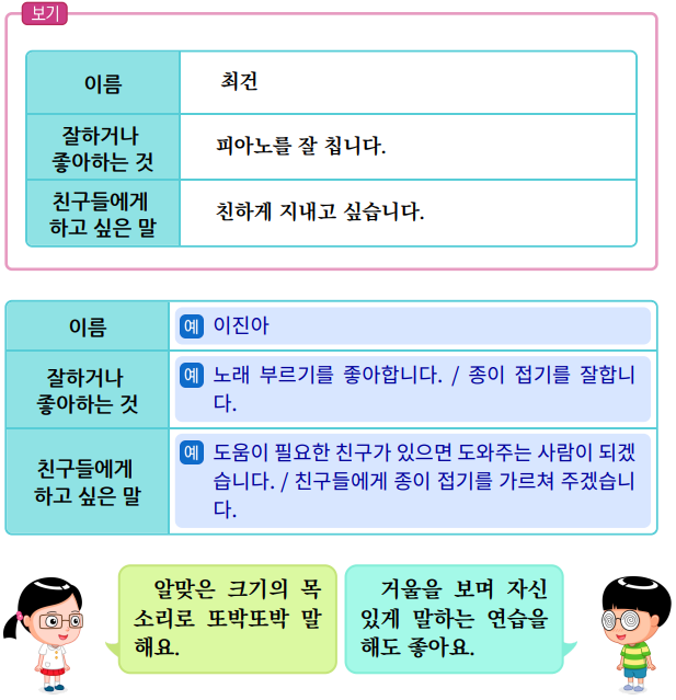 - 그림 “나”의 여자아이처럼 발표하면 좋은 점은 무엇일까요? 예) 듣는 사람이 잘 알아들을 수 있습니다. / 말하려고 하는 내용을 정확하게 전달할 수 있습니다.