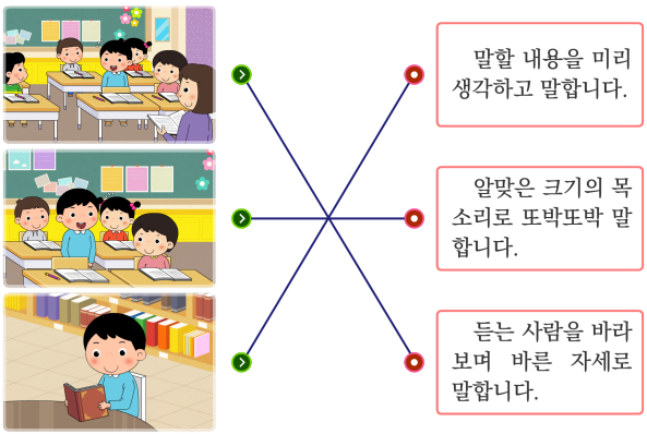 (1) 바른 자세로 말하는 그림과 방법을 알맞게 선으로 이어 봅시다.
