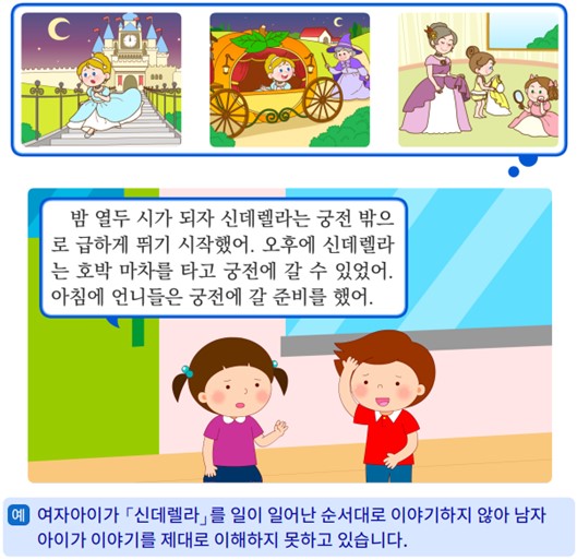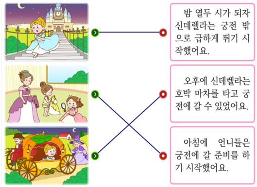4. 그림과 일어난 일이 어울리게 선으로 이어 봅시다. (1) 「신데렐라」를 일이 일어난 차례대로 말해 봅시다. 예) 아침에 언니들은 궁전에 갈 준비를 하기 시작했어요. 오후에 신데렐라는 호박 마차를 타고 궁전에 갈 수 있었어요. 밤 열두 시가 되자 신데렐라는 궁전 밖으로 급하게 뛰기 시작했어요.