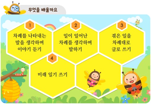 그럼, 지금부터 아이스크림 홈런과 함께 2학년 1학기 6단원 차례대로 말해요에 대해 학습 내용을 알려드리겠습니다.