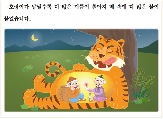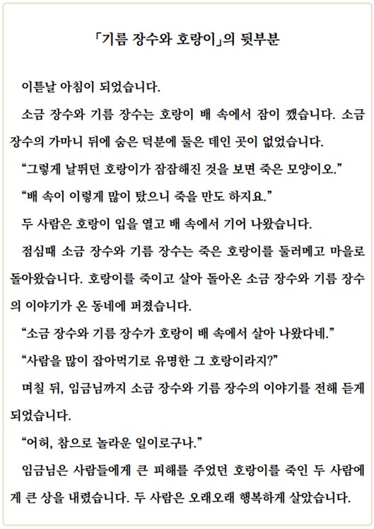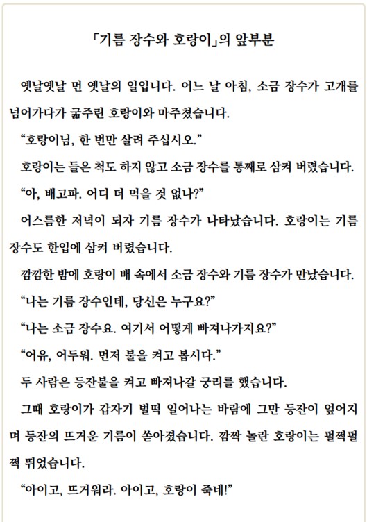 (5) 「기름 장수와 호랑이」에서 일어난 일을 친구들과 이야기해 봅시다.