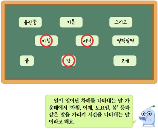 (3) 「기름 장수와 호랑이」의 앞부분을 다시 듣고 시간을 나타내는 말을 찾아 표를 해 봅시다.