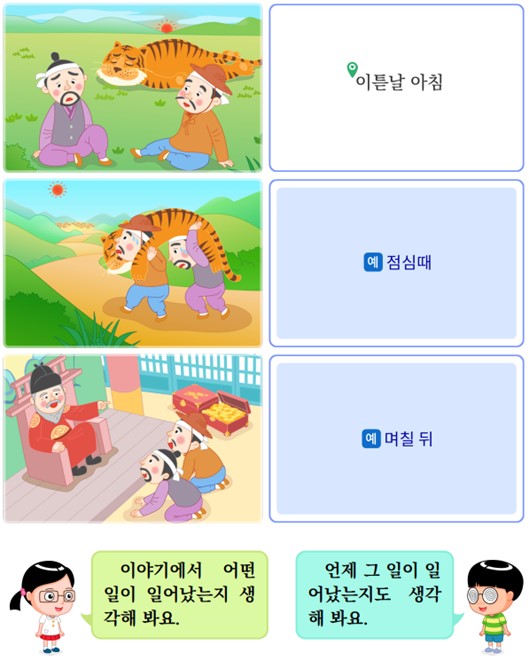 (4) 「기름 장수와 호랑이」의 뒷부분을 들어 봅시다. 그리고 그림에 알 맞게 시간을 나타내는 말을 써 봅시다.
