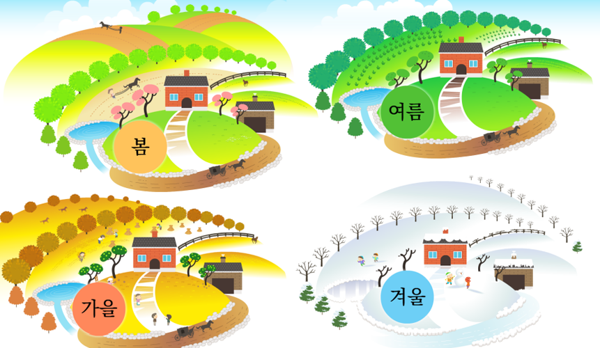 (1) 계절에 따라 무엇이 바뀌고 있나요? 예) 봄에는 밭을 갈고, 여름에는 물에서 놀고 있습니다. 가을에는 추수를 하 고, 겨울에는 스케이트를 타고 눈사람을 만들고 있습니다.