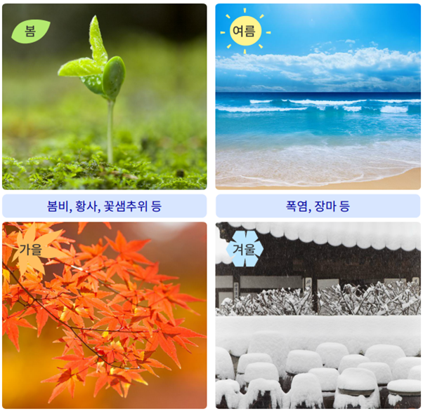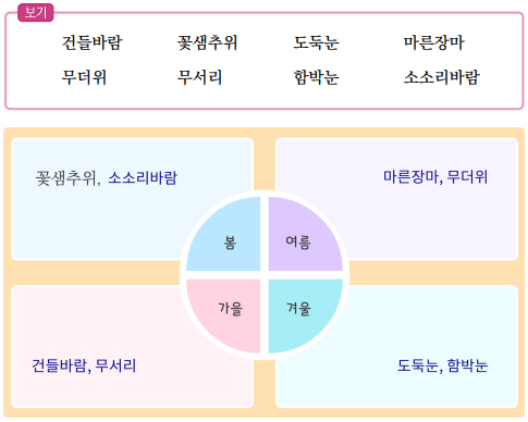 2) 계절별로 날씨와 관련된 낱말을 떠올리며 「날씨를 나타내는」을 읽어 봅시다.