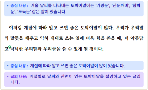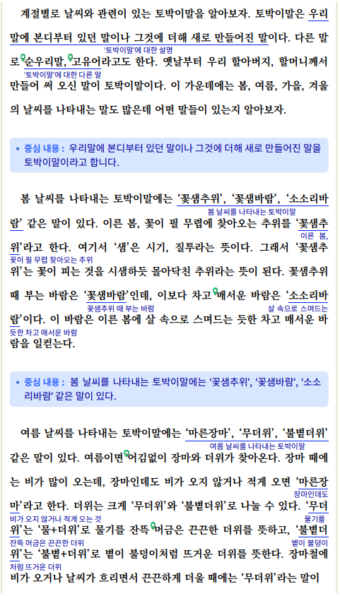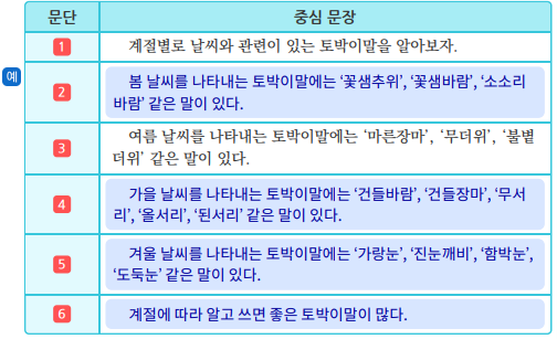 3) 「날씨를 나타내는 토박이말」의 중심 생각을 찾아봅시다. (1) 각 문단의 중심 문장을 정리해 보세요.