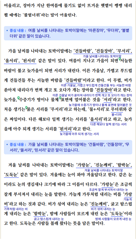 6) 「날씨를 나타내는 토박이말」을 읽고 더 알고 싶은 토박이말을 책이나 누리집에서 찾아봅시다. 예) 가을 날씨를 나타내는 토박이말에는 ‘갈잎’(가을이 깊어져 바람이 차가워질 무렵 나무에서 떨어지는 잎을 말하며 ‘낙엽’과 비슷한 말.),