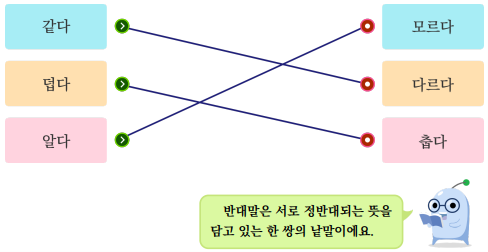 5) 「날씨를 나타내는 토박이말」에 나오는 낱말 사이의 관계를 알아봅시다. (1) 서로 뜻이 반대인 낱말을 찾아 선으로 이어 보세요.