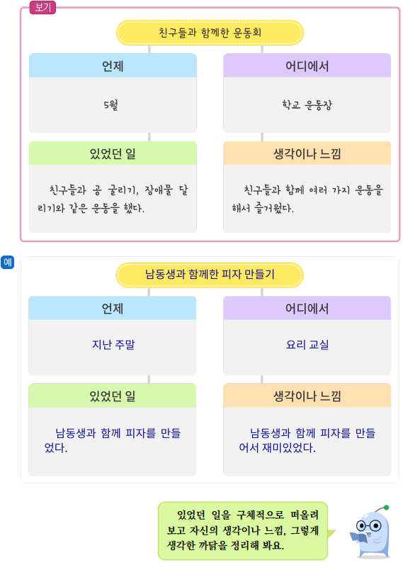 4. 위 글에서 이야기한 일 가운데에서 기억에 남는 일을 와 같이 간단히 정리해 봅시다.