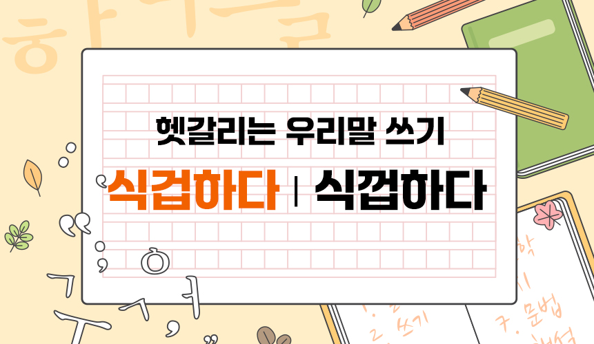 '식겁하다'는 ' 뜻밖에 놀라 겁을 먹다'는 뜻이 에요. 경상도에서 자주 쓰는 말이라 표준어인 해설 줄 모르는 경우가 많고, 경상도 사투리의 강한 억양 때문에 '시껍하다'로 잘못 쓰는 경우가 많은데요. '식겁하다'가 국어사전에 올라 있는 표준어예요. 먹을 식(食)+겁낼 겁(怯)+하다 로 이뤄져 있음을 기억하면 헷갈리지 않을 거예요.