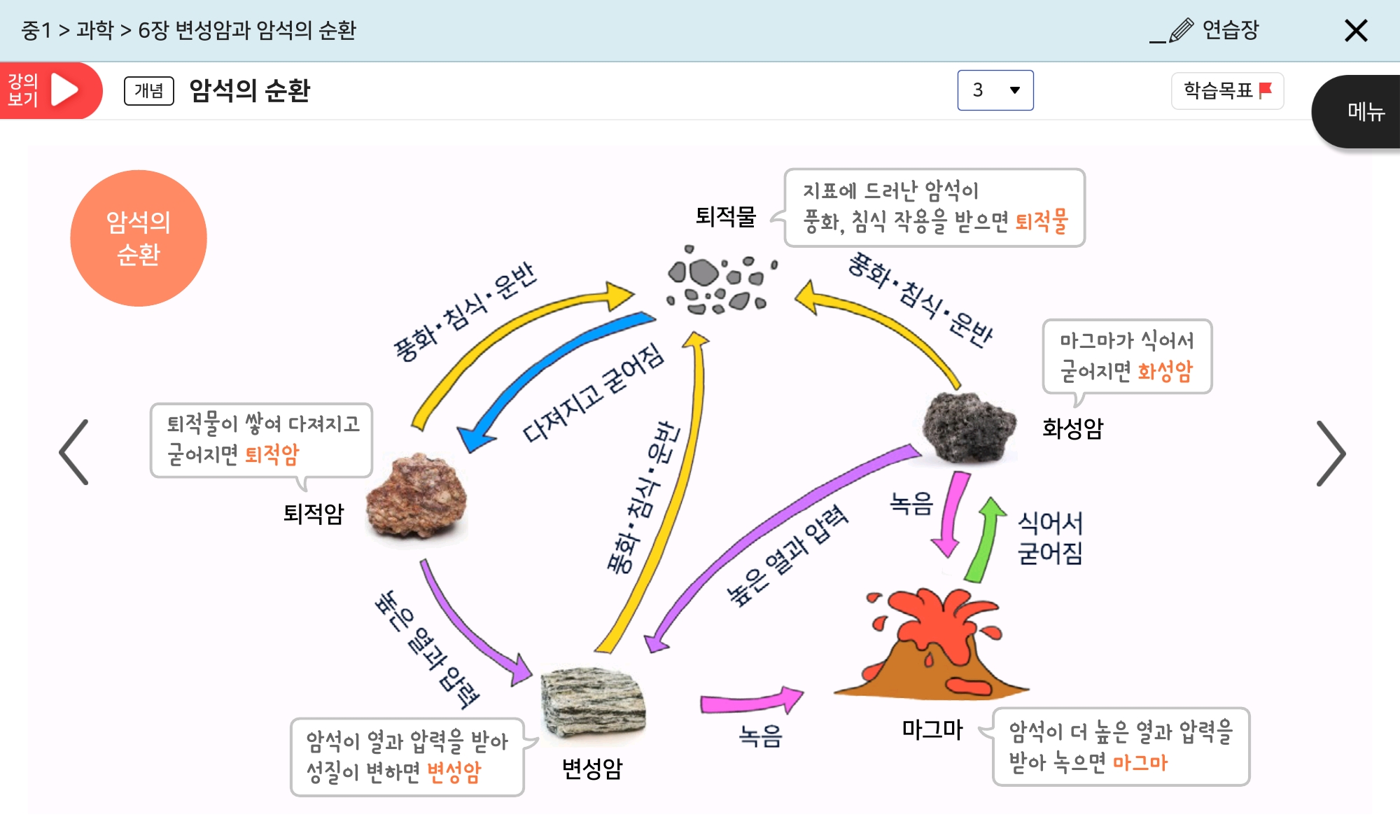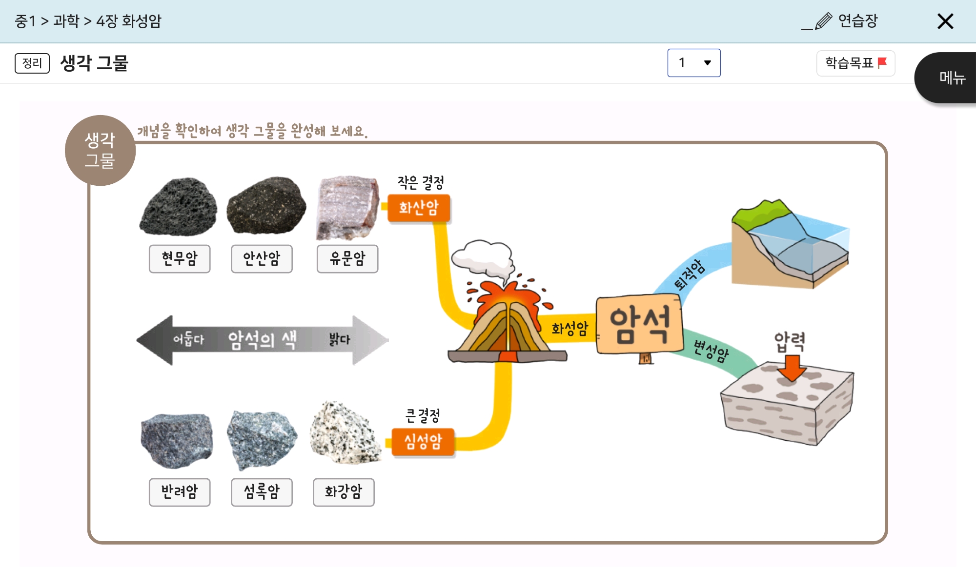 중학교 1학년 1학기 과학의 첫번째 단원에서 배우는 지각을 이루는 암석에 대해서 설명해드릴게요.