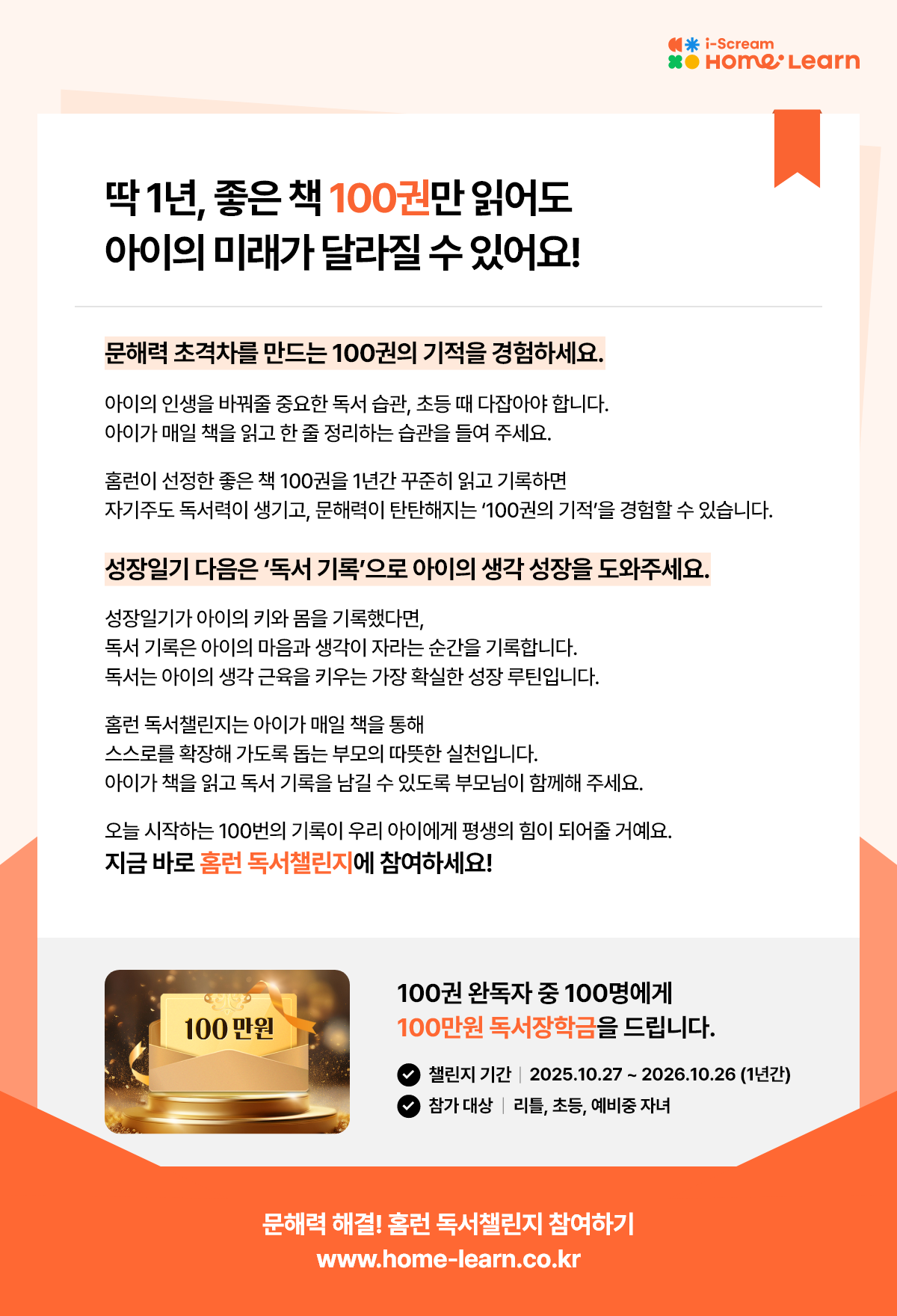 홈런 독서챌린지 오픈! 독서 장학금 100만원을 드려요!